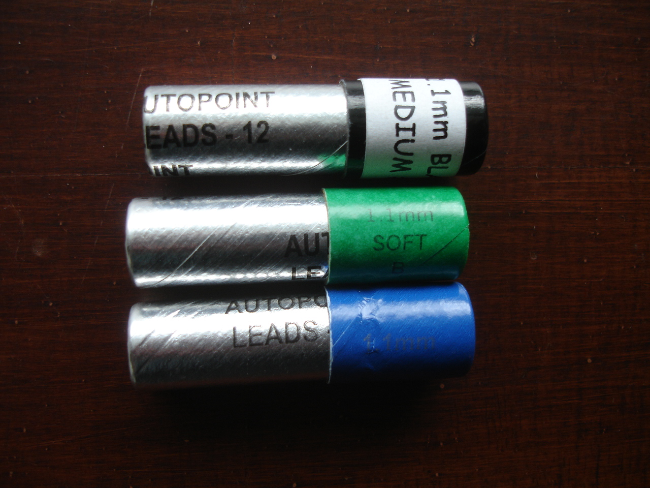The Autopoint Company obligingly still provides thick lead, 1.1 mm, in black, red, green and blue. The blue, green, and red are soft, while the black is medium (HB). It comes in these spiffy silver cardboard tubes.